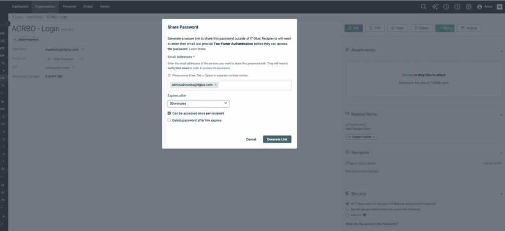 In 2025, IT Glue introduced Password SafeShare, a zero-trust approach to credential sharing built specifically for real IT workflows. Instead of relying on emails, screenshots or consumer-grade tools, teams can securely share read-only credentials with full control and accountability.